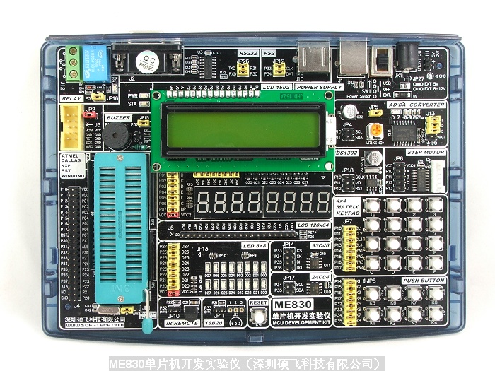 ME830集成有强大的硬件资源,并采用灵活的硬件资源搭配方案,各功能模块各自独立,既可简单地使用短路帽进行默认的资源连接(方便初学者直接使用),也可以取下短路帽后采用杜邦线连接单片机的任意I/O口线,轻松搭建自己的电路。这种独特的设计集方便快捷与灵活多变于一体,既解决了只能使用固定线路的局限,也避免了只能用排线连接的烦琐,过多的排线可能会阻碍观察和操作板上的硬件资源。
